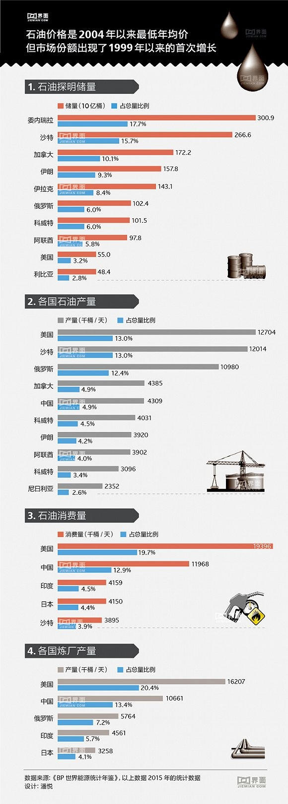 石油消费量方面,去年全球石油消费增长了190万桶/日,上升1.9%——几乎是近期历史均值1%的两倍,并显著高于2014年110万桶/日的增长。