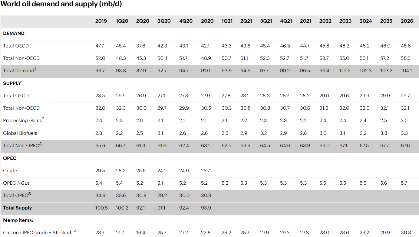 月报显示,到2026年,石油总产量将从2020年的6年低点9400万桶/天增加1020万桶/天。其中中东地区将主导2021-2026年的供应增长,而美国的供应增长与近几年相比将更为温和。
